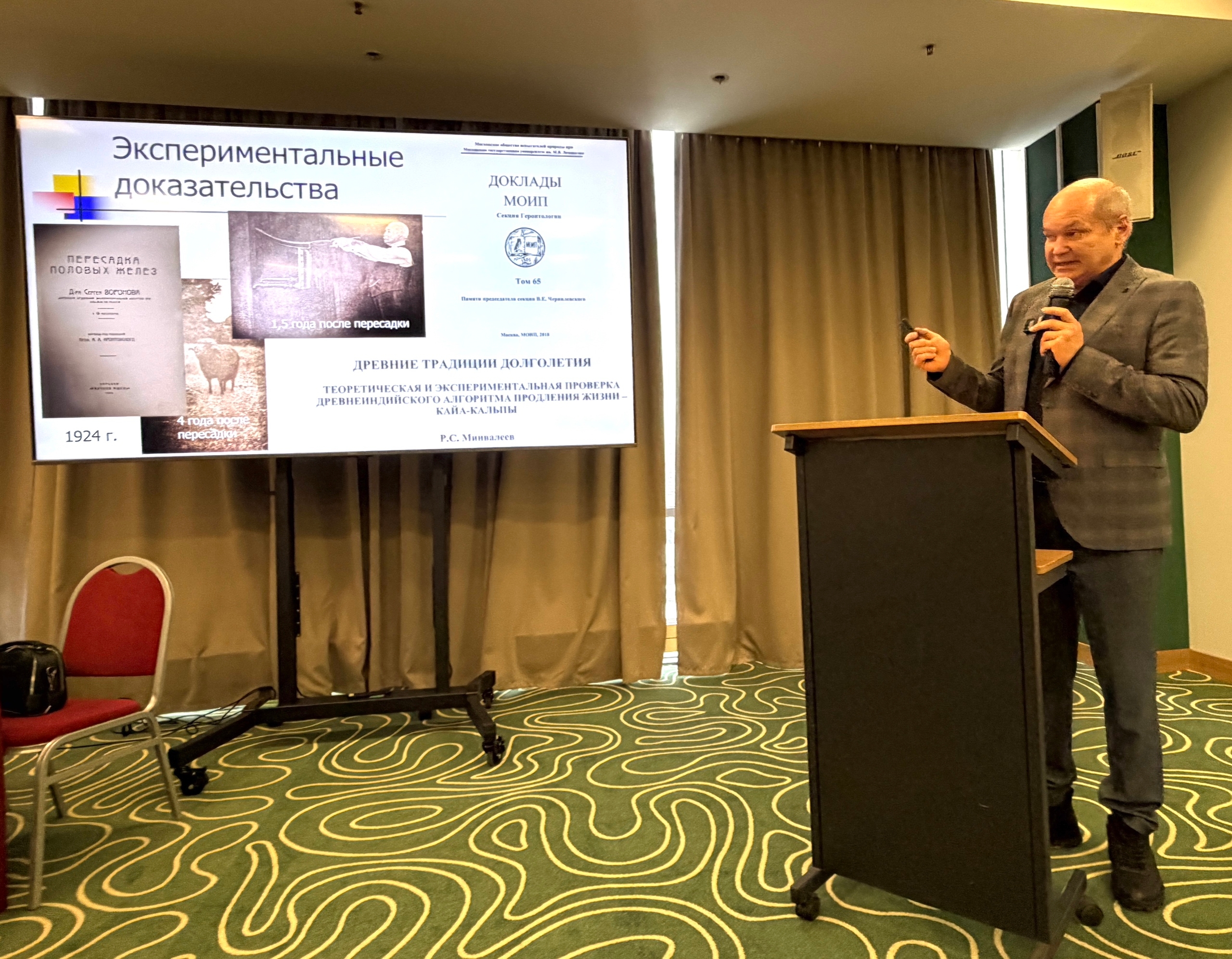 27 февраля 2026 года на V Научно-практической конференции «Вопросы гериатрии: встреча с экспертами» выступил профессор СПбГУ Ринад Минвалеев с докладом "Теоретическая и экспериментальная проверка древнеиндийского алгоритма продления жизни по мотивам элевационной теории старения В.М.Дильмана". На фоне преимущественно медицинских докладов, в которых обсуждались вопросы применения в гериатрии (медицине старения) тех или иных фармакологических препаратов, выступление Ринада Минвалеева было посвящено применению в наше время древних алгоритмов продления жизни, а в пределе - достижения бессмертия, чем в свое время занимались лучшие умы человечества, включая Исаака Ньютона. В рамках авторского проекта Ирины Архиповой "В поисках утраченных знаний" (с), направленного на поддержку российской науки, среди прочих успешно решаемых задач под научным руководством Ринада Минвалеева уже более 20 лет ведется изучение древнеиндийского алгоритма продления жизни Кайа Кальпы (санскрит: Вечное Тело). Элевационная или гормональная теория старения ленинградского онкоэндокринолога Владимира Михайловича Дильмана нашла свое неожиданное подтверждение в средневековых текстах индийской йоги, что мы экспериментально проверили на примере влияния правильно выполненной позы кобры (бхуджангасаны) на продукцию стероидных гормонов, которые сдвигаются в сторону преобладания анаболических процессов, характерных для более молодого организма.